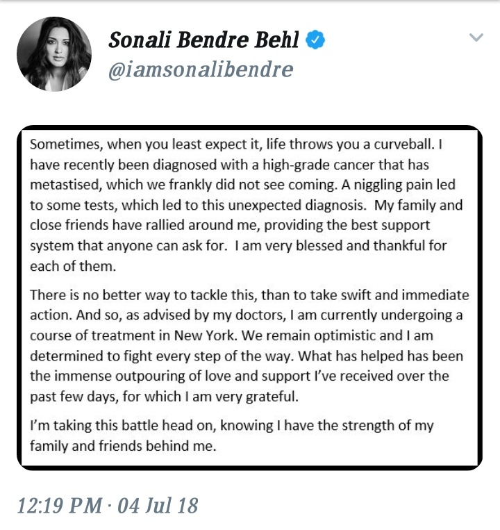 Popular versatile actress Sonali Bendre recently diagnosed with high grade Metastatic cancer. The actress herself broke the news on her twitter account to everyone. Sonali said, No one saw that coming. A niggling pain led to some tests and tests led to this diagnosis. As soon as she received the news the actress strongly stood up to this crucial situation which is surely commendable. Without wasting any time the actress and her family initiated to take the necessary actions. She is currently in New York for her treatment. Her family and friends are pouring love and wishes on her, constantly reminding her about her strength and showing their support.
