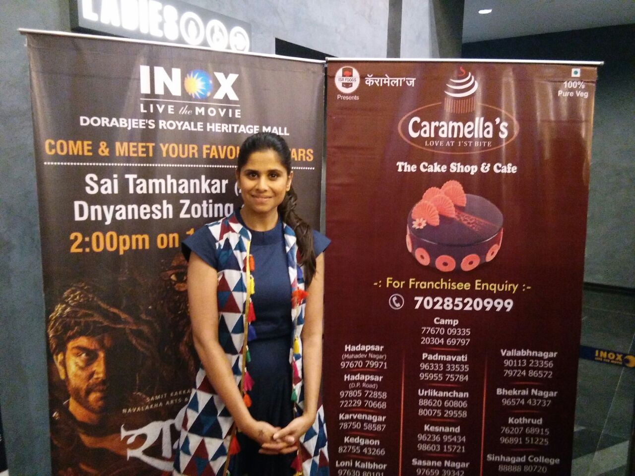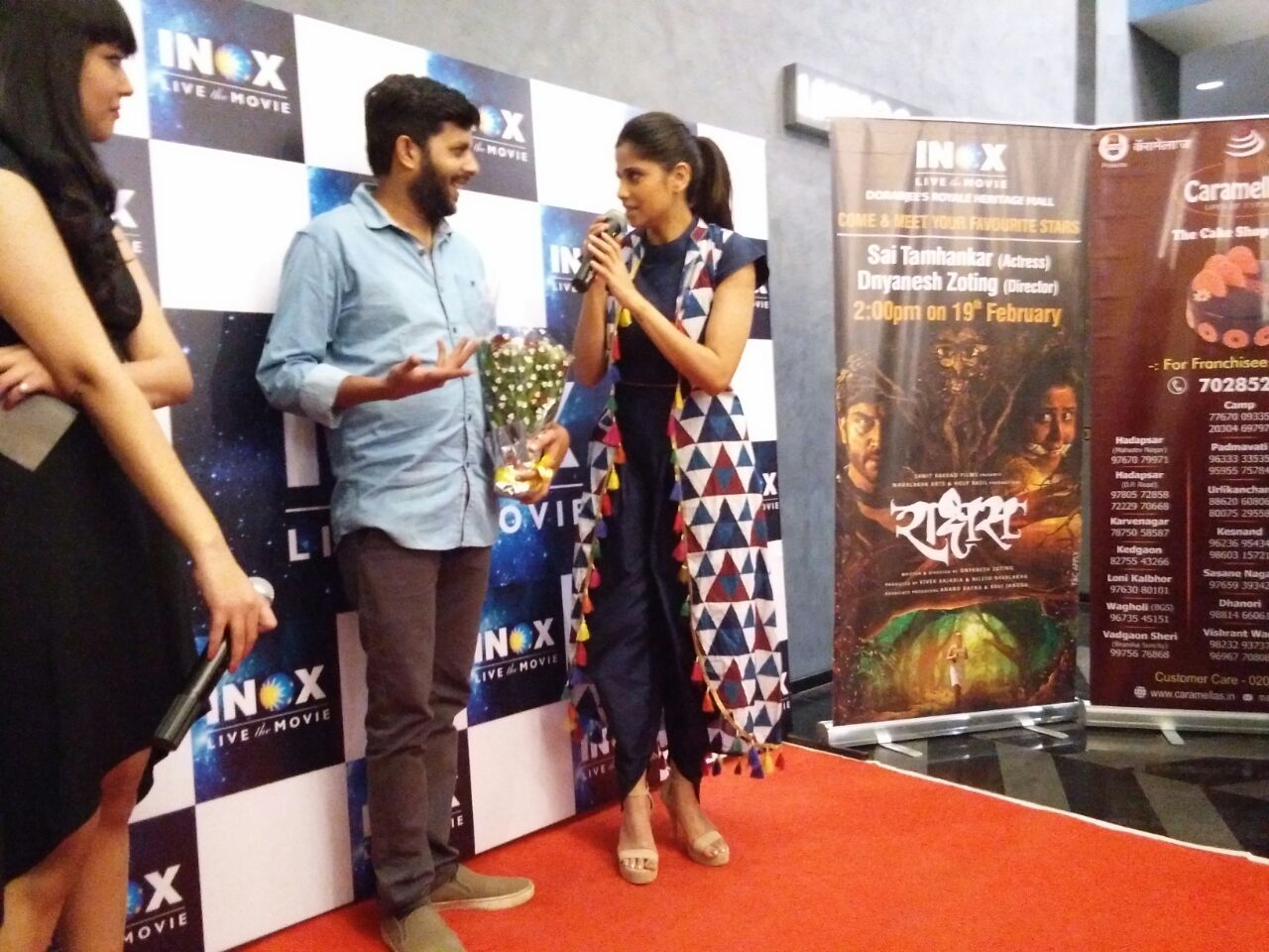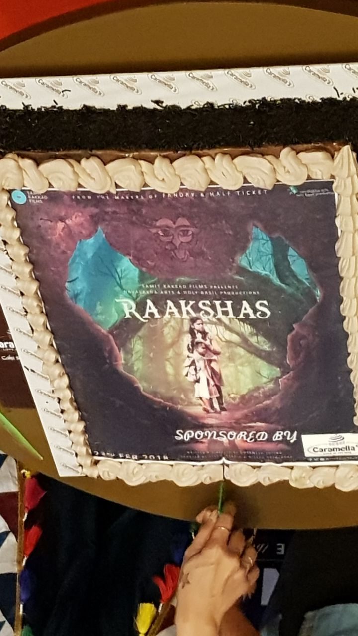 Sai Tamhankar and Sharad Kelkar starrer Marathi fantasy thriller film Raakshas is all set to release on 23rd February 2018, Friday. Director Dnyanesh Zoting is an ex student of Lalit Kala Kendra, Pune University. Today on 19th February, he has been invited as a chief guest there at DMCS National Short Film Festival. Here he and Sai Tamhankar visited this Short Film Festival and promoted their film. They inaugurated this festival which will be held today and tomorrow. Here Sai Tamhankar and Dnyanesh Zoting shared the experience and moments of Raakshas. Like, the whole film is shot outdoor, most of the part is shot in Gujarat. When they were shooting a tiger came and sat near their Vanity because of this they couldn’t come out to shoot a scene. Also there was a monkey who bit Sai Tamhankar. These and experiences like these were shared by both the celebs. Apart from this they also visited INOX mall to promote their movie. Here Sai Tamhankar’s fans Saiholics team members came to surprise her with their loving visit. They came wearing monster masks and showed their love for Sai and the film. Sai also did the cake cutting here and the cake was beautiful and had a picture of film Raakshas on it.