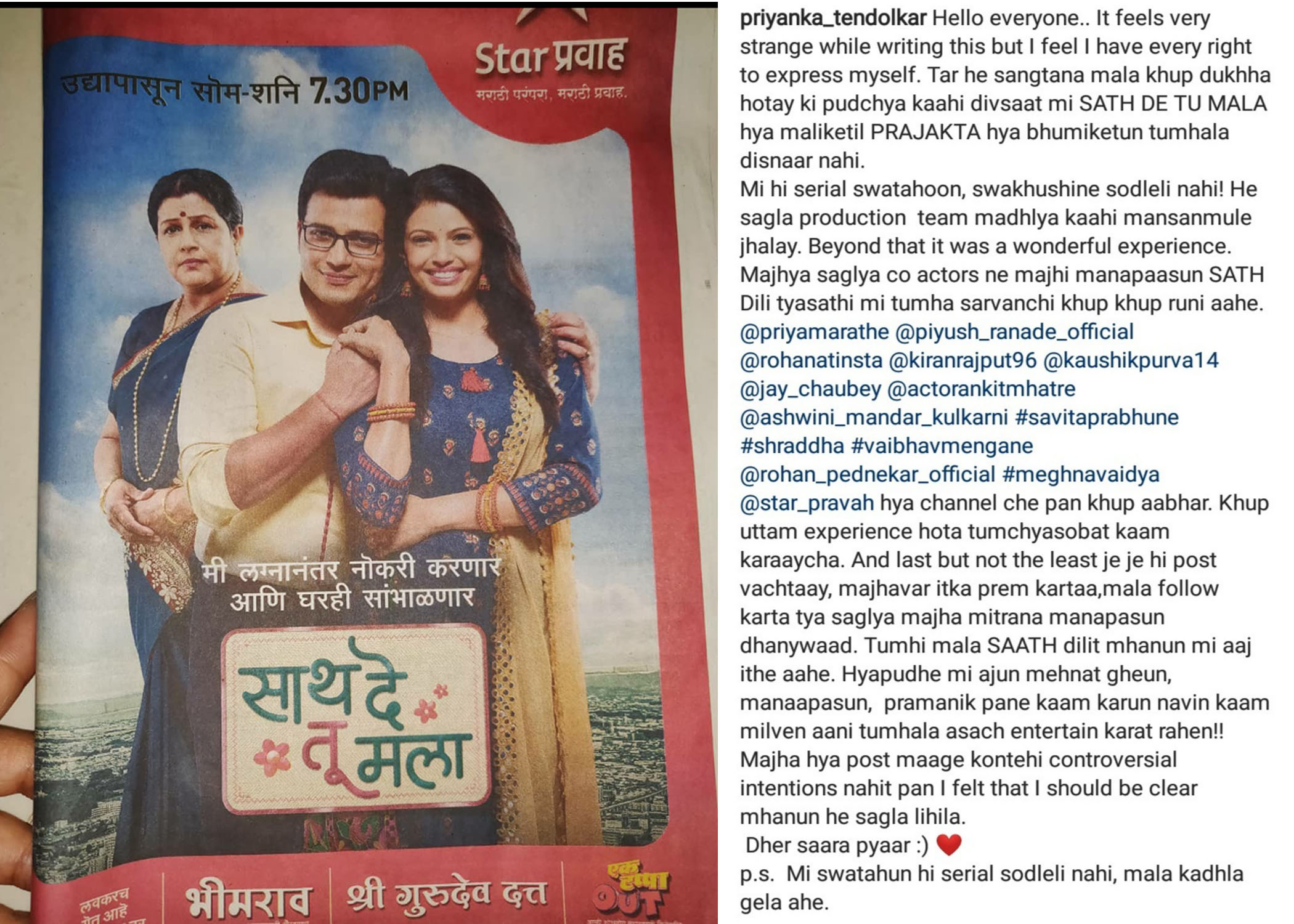 As you can see she mentioned about the problem with the production. She is thankful to channel and her co-artists but because of the dispute with the production she had to kiss goodbye to the show. New actress Vedangi Kulkarni will be portraying Prajakta now. New episodes featuring Vedangi will be on air from this Thursday.
